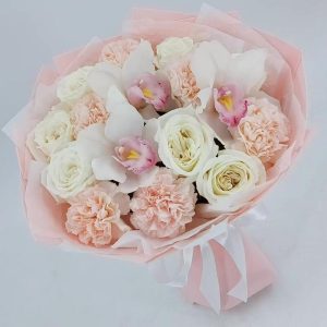 Букет из синих орхидей и розовых роз. Букет 128 ALMOND ROSES